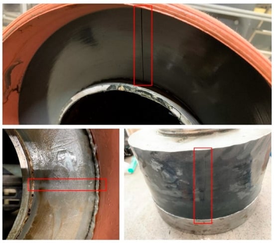 Cracks in the cement during preparation of casing–cement composites (Red frames are used to mark the position of the cracks). The reader can refer to the online version for a better view of the cracks.