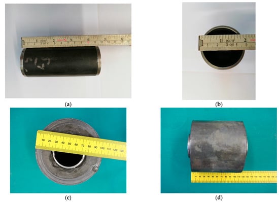 Preparation stages of casing–cement composite; (1) sealing surfaces of the steel pipe; (2) tubular steel including casting molds; (3) composite sample immediately after cementation; (4) composite sample 24 h after the casting process.