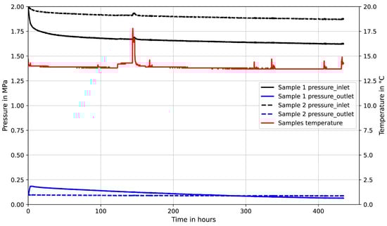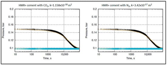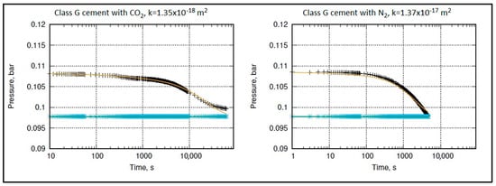 The permeability of both types of cement was also measured at high effective pressure (4.2 MPa), and the results are shown in Figure 14 and Figure 15. The results show that both cements are tight to CO2. It can be seen from Figure 14 that there was no estimation of the permeability of HMR+ due to its tightness, while the permeability of both class G samples is on the order of 10−20 m2 or less, which confirms the high quality of the prepared cement. A second sample of HMR+ cement showed the same pressure trend in Figure 14.