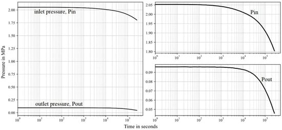 Figure 12 and Figure 13 show the permeability measurement of class G and HMR+ cement with two different gases (CO2 and Nitrogen (N2)). It can be seen that CO2 did not flow through the cement core. The curve of the inlet chamber is decreasing while the pressure in the outlet chamber remains almost constant. The pressure drop is mainly due to CO2 solubility in water and CO2–cement interaction. This indicates that the calculated permeability (k) is within an acceptable range for wellbore cement.