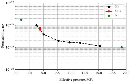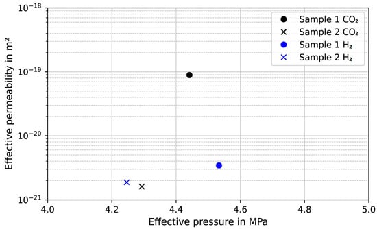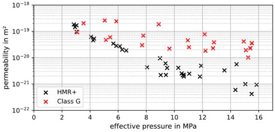 In order to evaluate the reactivity of class G cement with CO2, additional measurements with H2 were carried out after the samples were exposed to CO2. The results with H2 correspond to the results with CO2 for sample 2, where the permeability is very low. As for sample 1 (Figure 16), where the permeability with CO2 is relatively higher compared to sample 2, permeability with H2 is lower than with CO2 owing to reactivity with cement which is higher at higher permeability. The significant permeability reduction in sample 1 is an indication of CO2 penetration into the cement matrix having higher contact, causing more reaction and resulting in lower permeability. As for sample 2, CO2 penetration is difficult due to the very low permeability; therefore, the interaction with cement is limited, and the permeability remains almost constant. Further measurements with H2 were carried out on class G and HMR+ samples at different effective pressures to observe the effect of effective pressure on the permeability, and the results are illustrated in Figure 17. Generally, the permeability of HMR+ is lower than class G cement and for both cement types, the permeability decreases with increasing effective pressure as can be seen from Figure 17.