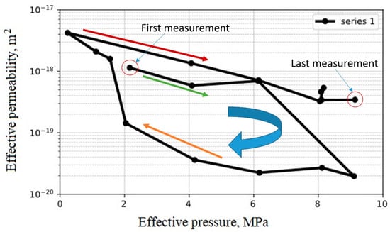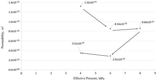 The second batch of experiments was to investigate the effect of pressure cycling on the composite casing–cement. This study took about six months to complete, and the results can be seen in Figure 24. By increasing the effective pressure to 9 MPa, the minimum permeability at 2 × 10−20 m2 was reached. On the other hand, when decreasing the effective pressure, the permeability increased but at a lower path than the original. At an effective pressure of about 1.7 MPa the permeability increased to 10−18 m2. It appears that micro-cracks opened at this effective pressure, which could have occurred during the period of the pressure reduction from 9.0 to 2.0 MPa (cement expansion), and these micro-cracks opened when the confining pressure was reduced. Further reduction of the confining pressure leads to an increase in permeability. After that, an increase in confining pressure caused the permeability to decrease due to the higher effective pressure. At an effective pressure of around 8.0 MPa, permeability measurement was recorded at different time steps to observe if it dropped close to the first measurement, but it retained a value at around 4 × 10−19 m2. Further increasing the effective pressure to 9.0 MPa made no difference, and the permeability value was kept constant. This is probably due to the fact that the cracks did not fully close.