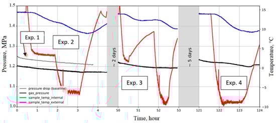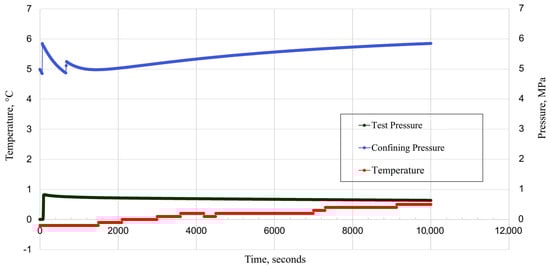 Overall, the results of temperature cycling presented here (casing–cement and cement–CT) conform with our previously published results [51,66]. Todorovic et al. [42] conducted similar experiments on wet composites of casing–cement–rock, and they observed no change in cement structure using CT scanning when they applied cooling down to −40 °C on the composite. Roy et al. [67] carried out experiments on the dry casing–cement–rock composite in the range of −50 °C–+80 °C and observed no change in cement structure using a CT scan as well. However, experimental studies by Todorovic et al. [42] and Roy et al. [67] were carried out without confining pressure, e.g., the worst-case scenario. We believe that effective permeability measurement is more reliable than a CT scan, where its results are resolution-dependent.