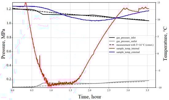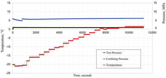 The tightness test of casing–cement composite was performed at an effective pressure of 1.6 MPa and a subzero temperature of −9 °C compared with the reference test at ambient temperature.