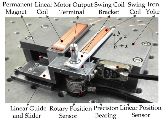 This paper focuses on the study of the tracking performance of a novel two-DOF VCM, which is applied as an end-effector of an optical fiber alignment system. The end-effectors of high-performance multi-dimensional motion platforms directly act on their terminal properties [1,2,3]. In order to improve the precision and reduce equipment size, multi-degrees-of-freedom motors are potential force sources for these end-effectors [4,5]. The novel two-DOF VCM has the advantage of a higher power–mass ratio and lower thrust (torque) ripple [6]. The structure of this novel two-DOF VCM is shown in Figure 1. Its linear mover and rotary rotor share one stator; this stator employs one permanent magnet (PM) to excite the main magnetic field, and the PM is magnetized in the direction of y. A Lorentz force will act on the linear coil of this two-DOF VCM when current flows through it; then, a linear reciprocating motion along direction x is produced. A Lorentz force also will be imposed on the rotary coil when current flows through it, but a rotary motion around the axis of the precision bearing is generated due to the special mechanism of the rotary coil and its bracket. The peculiarities of this novel two-DOF VCM are as follows: