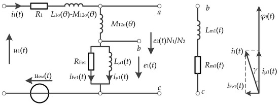 As i1(t) is variational, the magnetic flow in the iron core φi(t) is generated only by iμ1(t), and the open-circuit voltage e2(t) of the linear coil is induced by Lμ1(t) and M12σ(θ). The phase difference between i1(t) and iμ1(t) is γ. Rm1(t) and Lm1(t) are the excitation resistance and inductance for the swing motion, respectively, which are accorded with