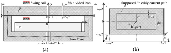 Based on the structure of the 2-DOF VCM, the initial magnetic flux caused by the PM to the different parts of the iron is different. This paper equally divides the iron into 2n parts along the main magnetic path, which is shown in Figure 3a. The width of each part is l0; l0 is tiny, and l0 = l/2n; l is the length of the main magnetic path. There are many eddy current loops within the cross-area of jth divided iron, and a supposed eddy current loop of the area of 4rz2 is shown in Figure 3b, which is z away from the center line. φi(z) is the magnetic flux of 4rz2 that is caused by iμ1(t), r = lcy/lm, and lcy and lm are the lengths of the iron core in directions y and z, respectively; l is the length of the iron core.
