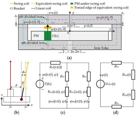 Analysis of armature reaction: (a) magnetic circuit of swing motion, (b) equivalent position of swing coil, (c) equivalent magnetic circuit of PM, and (d) equivalent magnetic circuit of N1iμ1(t).