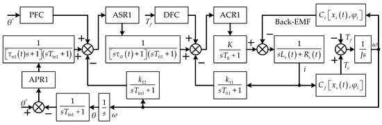 which indicates that the parameters of Fn(s) are changed as τi1(t), Kc1(t), and Ce [xs(t), φi] and effectively keep the accuracy of the DFC. A filter link is added after ASR1, and the current loop is treated as an inertia link; then, the open-loop transfer function of the speed-loop Wos(s) can be written as