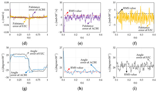 Tracking performance of reciprocating motion (angle is from −8° to +8° and f = 1 Hz) under ACBE and FZC: (a) angle input of reciprocating motion, (b) palstance input of reciprocating motion, (c) armature current of ACBE and FZC, (d) palstance track error of ACBE and FZC, (e) palstance track error of ACBE and its RMS value at uniform motion, (f) palstance track error of FZC and its RMS value at uniform motion, (g) angle track error of ACBE and FZC, (h) angle track error of ACBE and its RMS value at uniform motion, and (i) angle track error of FZC and its RMS value at uniform motion.