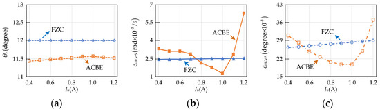 Iu is the armature current at uniform motion, which can be increased by adjusting the friction torque. Different Iu changes the accuracy of the control parameters of ACBE, which determine the tracking performance of ACBE. θe is effective travel, and eωRMS and eθRMS are the RMS values of eω(t) and eθ(t) at uniform motion, respectively, which are evaluating indicators of tracking performance. Figure 12 shows the impact of different Iu on the θe, eωRMS, and eθRMS of ACBE and FZC. When Iu is changed from 0.4 A to 1.2 A (step size 0.1 A), the θe of FZC is always a constant, the eωRMS of FZC hardly changes, and the eθRMS of FZC is changed from 25.7 × 10−3 degrees to 28.9 × 10−3 degrees as the Iu increases. For ACBE, the θe, eωRMS, and eθRMS have a similar change trend as the increase in Iu; their best points are all around Iu = 1 A, which is the critical saturation point of the iron core. When ACBE works at the critical saturation point of the iron core, its parameters have the least fluctuation. The values of Iu not only determine the accuracy of the ACBE parameters at the uniform motion but also at the acceleration motion. When the armature current is closer to 1 A, the accuracy of ACBE parameters is higher. Compared to FZC, ACBE is more affected by the change in armature current, but within Iu = [0.8 A 1 A], the tracking performance of ACBE is better than that of FZC, especially when Iu is around 1 A.