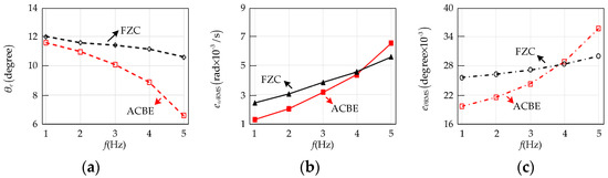 Except for the armature current, the reciprocating frequency f also can affect the accuracy of the control parameters of ACBE. The angle range of the reciprocating motion is kept at −8° to +8°, and Iu is around 1 A. Figure 13 shows the impact of different f on the θe, eωRMS, and eθRMS of ACBE and FZC. As f increases, the acceleration and amplitude of the given palstance curve (trapezoidal wave) become bigger, which increases the armature current at acceleration motion and the displacement at the sampling interval. So, the tracking performance of ACBE and FZC declines as f increases. An increased armature current seriously degrades the accuracy of the control parameters of ACBE at acceleration motion; the θe of ACBE decreases more than that of FZC as f increases, which is shown in Figure 13a. At uniform motion, increased f also reduces the accuracy of the control parameters of ACBE. The eθRMS and eωRMS of ACBE are more than those of FZC when f exceed 3 Hz and 4 Hz, respectively, which is shown in Figure 13b,c. ACBE is more affected as f increases, but within f = 3 Hz, the tracking performance of ACBE is still better than that of FZC.