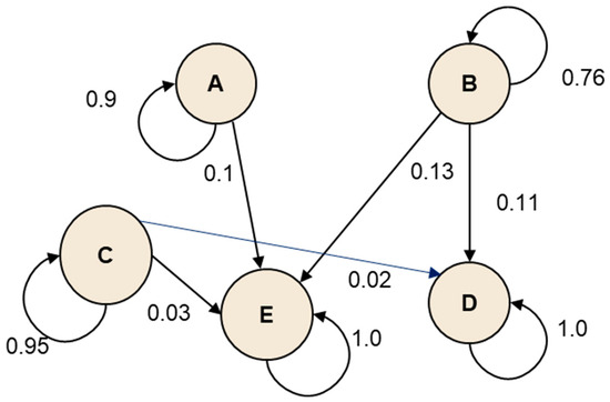 To model the CII rate transition, the Markov [16] chain can be employed. The information required to specify the chain as a set of states , with a probability mass function for the start configuration and a conditional probability mass function.