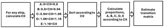 The short and long-term behaviour of ship CII rate, with a discrete set of states, will be investigated using Markov chains, which is one specific example of the Markov process [16,17,18]. The behaviour of a stochastic system state of the ship CII rate, where the start of the subsequent state depends only on the system’s immediate prior state, will be described by the Markov process. In practice, most problems involving Markov processes are expressed using Markov chains with discrete or continuous time [19,20,21,22,23]. In this study, only Markov processes with discrete states are considered. This study established a methodology for estimating the ship CII rates and various operational parameters of vehicle carrier transition matrices using proportions data when there is a lack of available data. This methodology can serve as a foundation for risk-based models that use the CII rate as an input to determine the best ship energy efficiency management strategy. The methodology used in the present study requires limited data, and a wide range of conditions and problems could be addressed.