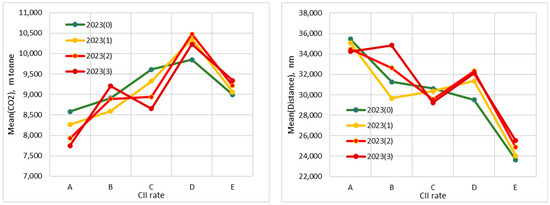 Mean value of CO2 (left) and Distance (right) as a function of CII rate, conditional on the annual legislation changes.