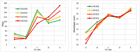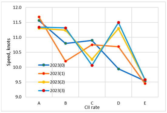 The (m tonne), distance in operation (nm), number of ships, ship age (year), and average travel speed for the five CII rates (A, B, C, D, and E) are computed according to the current legislation for the year 2023, imposing the implementation of the progressive changing the constraints of the five CII classes defined as 2023(0), 2023(1), 2023(2), and 2023(3) and shown in Figure 4, Figure 5 and Figure 6. However, due to higher uncertainties the voyage speed is calculated as: