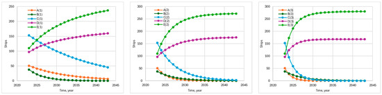 Transition of the number of ships as a function of time, conditional on the CII annual legislation change, 2023(1) left, 2023(2) centre, and 2023(3) right.