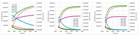 Cumulative charts displaying the number of ships, , and travelled distances indicate the precise quantity of each state’s transiting to a different CII rate at any given time (or model cycle). Furthermore, the disparity between various legislation policies is demonstrated by those parameters’ progression caused by ageing without introducing any enhancing measures.
