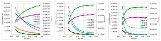 Figure 7, Figure 8 and Figure 9 show the strong correlation between , the number of ships with a given CII rate, and the distance travelled over time, subjected to the legislation changes about the ship’s energy efficiency. The results show that the 2023(3) police are significantly more aggressive, which causes a large number of ships to move toward the upper bound of CII rates and shorter travel distances.