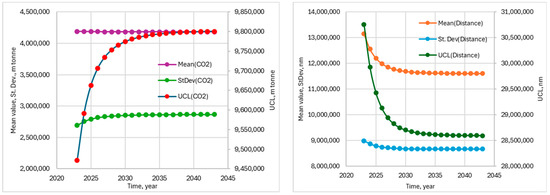 Mean value, St. Dev and UCL progress of the total CO2 (left) and total Distance (right) as a function of time, conditional to 2023(3) CII annual rules.