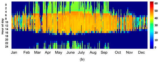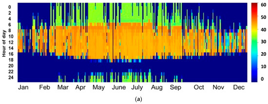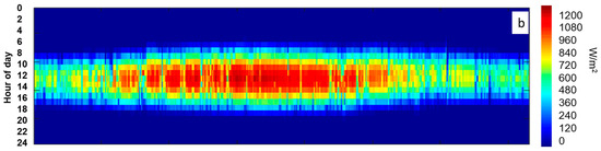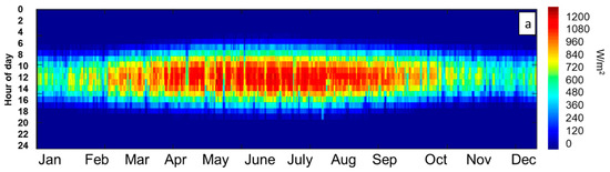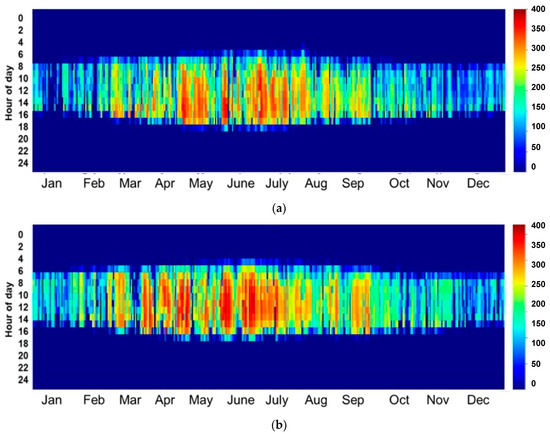 For the bankability of any solar project and to encourage investors and stockholders to invest in CSP power plants, a detailed assessment of the solar resources should be presented, preferably using in situ measurements. In this study and in order to overcome the inter-annual variation, three-year average solar irradiance data were collected from the fields of study and used as inputs for the simulation. One of the standard and most useful presentations of DNI values is a heat map. This configuration provides a clear idea of the distribution of irradiance values over the year. Figure 1 presents a heat map of the three-year average DNI data measured in the two field of study.