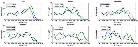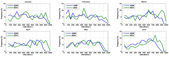 As can be observed, the site of Benguerir is highly irradiated in comparison to ABM, especially during the period from January to July. Nevertheless, both sites can be considered good CSP hosting locations, where DNI values higher than 600 W/m2 (the recommended DNI threshold for CSP applications [25]) are received for at least 6 h (from 10:00 AM to 4:00 PM) during winter and fall. During spring and summer, this period is even longer, and a CSP power plant can produce electricity for at least 11 h (from 7:00 AM to 6:00 PM). For more details about the site capacity production, the plot of the hourly DNI distribution frequency is of high importance. This information can help power plant operators to develop the optimal operation strategies and storage hours. Figure 2 presents the monthly distribution functions of the hourly DNI values for both sites. For a clear presentation, DNI values lower than 50 W/m2 were excluded. As can be illustrated, for the period from January to February, DNI values higher than 600 W/m2 represent 43% of the total daytime values for Benguerir and 32% for the site of Ain Beni Mathar. Similarly, these values present an average of 53.8% and 39.3% for the period from March to May, 44.4% and 34.7% from June to August and 39.4% and 29.7% from September to December for Benguerir and Ain Beni Mathar, respectively. With these values, we can say that the selected sites can be considered suitable for CSP hosting and that they are representative of the Moroccan case. We need to mention that for the MENA region in general and for Morocco in particular, very few are the stations that measure the DNI at the ground level; thus, the solar resource analysis and assessment presented in this section can be considered highly important for researchers and stakeholders interested by solar energy investigation in this region.