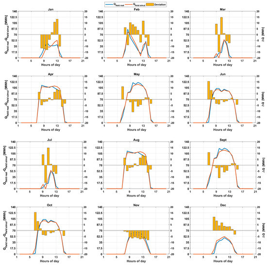 Returning to our original goal, to validate the used simulation tool, we selected 12 days (1 from each month) where the solar field was focused for the entire day, and we compared the thermal output from the simulation tool and the real measured data in situ. The deviations and validation results are denoted in Figure 4.