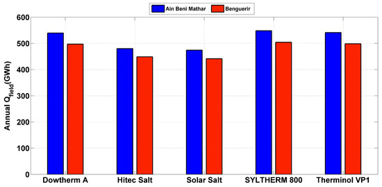 Yearly thermal outputs for all HTFs at Ain Beni Mathar and Benguerir.
