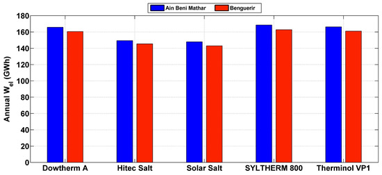 Yearly electrical outputs for all HTFs at Ain Beni Mathar and Benguerir.