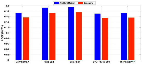 Furthermore, from an economic standpoint—as depicted in Figure 7—Syltherm 800 also emerges as the optimal choice for both locations, with costs of 0.1712 €/kWh for Ain Beni Mathar and 0.1548 €/kWh for Benguerir. Hence, Syltherm 800 emerges as the most suitable working fluid for the Moroccan climate and will be utilized in the subsequent operations.