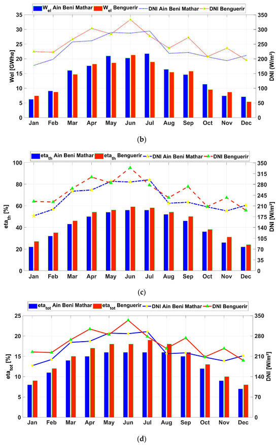 For more details about the performance of the investigated plant configuration, the monthly values of the thermal and electrical outputs are presented, together with the DNIs and the efficiencies in Figure 10. As shown in Figure 10a,b, June was the most irradiated month in Benguerir, with values reaching 334 W/m; this led to a peak in the thermal output of 70 GWh and an electrical output of 21.3 GWhe. For Ain Beni Mathar, the highest DNI values are recorded during July, with a DNI value reaching 295 W/m2, resulting in thermal and electrical generation of 75 GWh and 21.6 GWhe, respectively. The thermal and total efficiencies are illustrated in (Figure 10c,d). As can be noticed, the thermal efficiency at Benguerir is higher than the one at ABM, with the maximum values reaching 58% for Benguerir in June and 56% for Ain Beni Mathar during July. Similarly, the total efficiency reaches its max during June at Benguerir and during July at ABM, with values of 19% and 16%, respectively.
