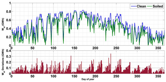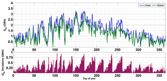 Figure 13 presents the daily thermal outputs for the two scenarios, together with the deviations between the production of the clean and soiled fields. As can be noticed, the daily difference between the thermal output of the two scenarios is very considerable, especially during the dry period of the year. In fact, during spring and summer, the daily deviation can reach 0.8 GWhth after two weeks of exposition without cleaning. Nevertheless, during fall and winter, the drop in the thermal performance due to soiling can reach 0.25 GWhth. This is completely reasonable since this period of the year is known for high rainfall values (which can be considered a natural cleaning agent) and low aerosol activity [43].