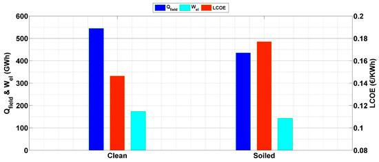 We need to mention that to calculate the LCOE of a CSP power plant while considering the soiling impact, the difference will be based on the amount of electricity produced, which is highly impacted by this factor, as it affects the optical properties of the solar field and thus the thermal and electrical performances. More details about the soiling impact are presented in Section 4.