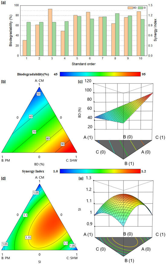 Biodegradability and synergy index (a), contour plots (b,c), 3D surface plots (d,e).