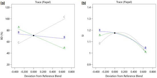 Piepel trace plot of biodegradability (a) and synergy index (b) (A: CM; B: PM; C: SHW).