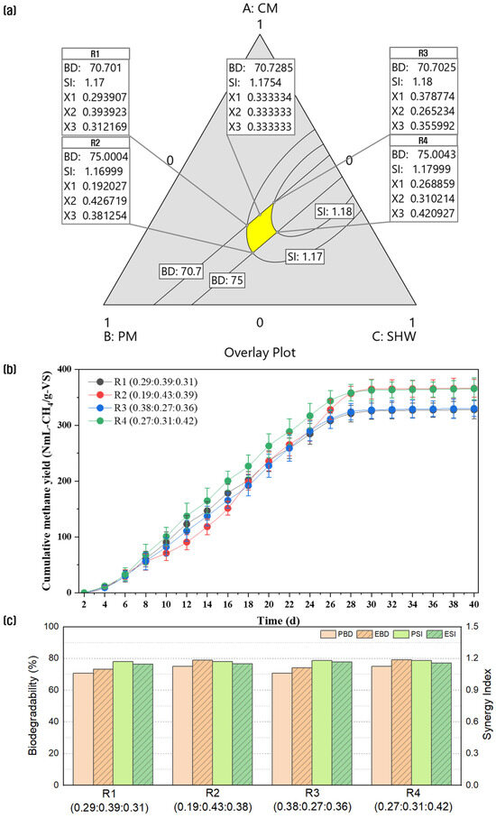 Overlay plot of co-digestion (a), biochemical methane potential test (b), and predicted and experimental biodegradability and synergy index (c).