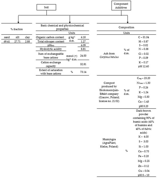 The soil used to establish this experiment was collected from a depth of 0.00–0.20 m of the arable humus in Tomaszkowo village, Olsztyn commune, Warmia and Mazury Province, Poland (53.7161° N, 20.4167° E). Before the experiment as established, the soil was sieved through a screen with a mesh size of 0.5 cm. Then, the fraction size composition and basic chemical and physicochemical properties of the soil were determined (Figure 1). The characteristics of the Carpinus betulus L. ash, compost, and HumiAgra used in the experiment are given in Figure 1.