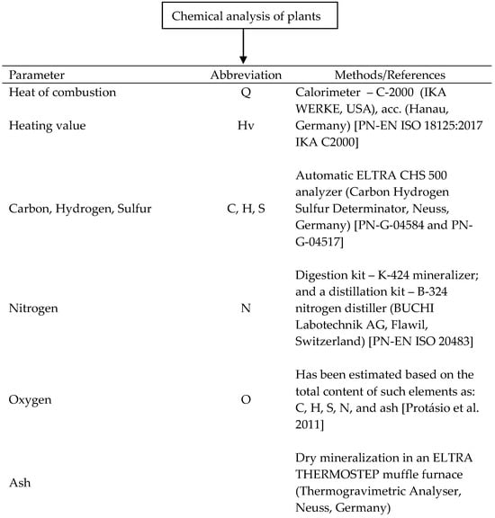 The chemical properties of the plants were determined as follows (Figure 2): the procedure for performing the calculations are described in Wyszkowska et al. [35].