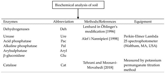 - Alef, K.; Nannipieri, P. Enzyme Activities. In Methods in Applied Soil Microbiology and Biochemistry; Alef, K., Nannipieri, P., Eds.; Academic Press Harcourt Brace & Company Publishers: London, UK, 1998; pp. 316–365. [Google Scholar]
