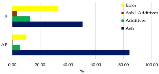 Coefficient of observed variation η2 (%). AP—yield of aerial parts; R—yield of roots.