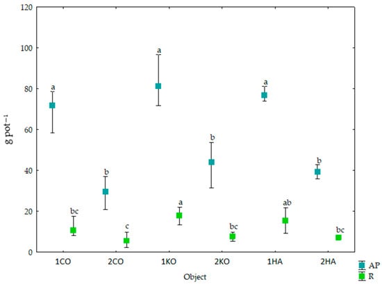 Dry weight of aerial parts and roots of maize from soil to which ash of Carpinus betulus was added in g pot−1. Explanations: 1—0 ash kg−1 of soil; 2—20 ash kg−1 of soil; CO—soil without additives; KO—soil with compost; HA—soil with HumiAgra. The same letters (a–c) denote homogeneous groups separately for aerial parts and roots.