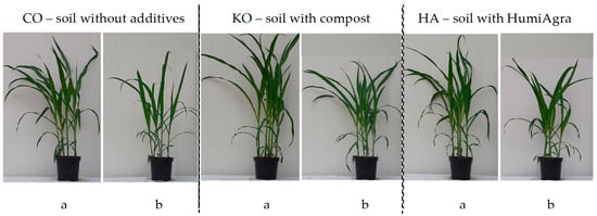View of Zea mays L. BBCH 39 (stage 9 or more knees) in soil containing ash from Carpinus betulus. Definitions are given in the Figure 6 caption, a—0 g ash kg−1 of soil; b—20 g ash kg−1 of soil.