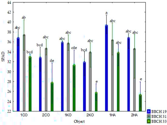 The application of wood ash, KO, and HA to the soil had no significant effect on the leaf greenness index (SPAD) of the maize (Figure 8). The SPAD values determined in the first two developmental stages of maize remained at similar levels. The maize’s SPAD decreased significantly only in the third stage of its development, i.e., the highest value was recorded in BBCH 19 and BBCH 31 and the lowest one in BBCH 33. These relationships were recorded in both unfertilized soil and soil fertilized with KO and HA.
