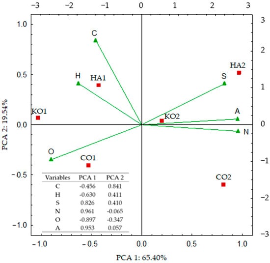 Statistical analysis of the PCA results showed the stimulating effect of ash from Carpinus betulus and the use of KO and HA on the C, H, S, N, and O as well as ash contents in the aerial parts of the maize (Figure 9). The PCA revealed that the first two PCs explained 84.94% of the total variability in the input data, dividing the data into two groups. The first group constituted carbon, hydrogen, and oxygen, whereas the second one constituted sulfur, nitrogen, and ash. The vectors of most of the analyzed elements were of similar length, except for hydrogen, whose vector was shorter, indicating its weaker contribution to data variability. The dispersion of the points suggests that the use of KO and HA had a positive effect on the content of the analyzed elements and ash in the aerial parts of the maize.