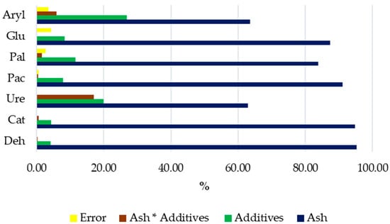 The activity of the analyzed soil enzymes depended most strongly on the dose of Carpinus betulus ash, as indicated by the percentage share of the factors of the observed variability, expressed as the η2 coefficient values, which was as follows: Deh—95.30%, Cat—94.76%, Pac—91.04%, Glu—87.32%, Pal—83.92%, Aryl—63.60%, and Ure—62.87% (Figure 10). The effect of the soil additives on its enzymatic properties was weaker. KO and HA elicited a stronger effect on the activity of three enzymes: arylsulfatase (26.85%), catalase (20.00%), and alkaline phosphatase (11.66%).