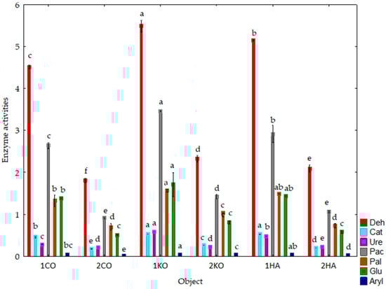 Enzyme activity in soil to which Carpinus betulus ash was added. Definitions are given in Figure 6 caption. Deh—dehydrogenases in μmol TFF kg−1 d.m. h−1; Cat—catalase in mol O2 kg−1 d.m. h−1; Ure—urease in mmol N-NH4 kg−1 d.m. h−1; Pac—acid phosphatase in mmol PNP kg−1 d.m. h−1; Pal—alkaline phosphatase in mmol PNP kg−1 d.m. h−1; Glu—β-glucosidase in mmol PNP kg−1 d.m. h−1; Aryl—arylsulfatase in mmol PNP kg−1 d.m. h−1. Subsets of the mean values are indicated by the same letters for each enzyme (a–f).