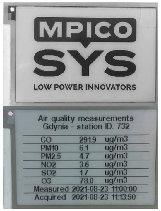 To evaluate the designed HEH, a real-life use case scenario was considered. The adapted use case scenario involved a low-power IoT device commercially offered by the MPICOSYS company [31]. The involved device consists of a 2.71” monochrome electronic paper display (e-paper) [32] and an ARM Cortex-M4 microcontroller enabling (long-range) modulation [33]. This IoT device and its features, including energy consumption, are detailed in [26,34]. According to the experiments carried out there, its energy demand per operating cycle is equal to 26.3 mJ, wherein, apart from the idle part of the cycle, the communication and actuation consume the amount of energy 21.5 mJ in 7.1 s, i.e., 3.03 mW of mean power [26]. Such mean power consumption is related to the uplink–downlink LoRa communication and actuation by the e-paper display content refresh. An example of the screen content after the operating cycle is shown in Figure 1.