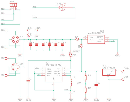 The essential element of the HEH is the ES securing appropriate conversion, storage, and management of the distributed and harvested energy of the waves and light. The ES design is presented in Figure 2. It converts the energy of high-voltage peaks of the PM-based WEC applied to the and terminals. This converted energy is stored in tantalum capacitors –. The process of wave energy conversion was reported in [26,34]. The light energy harvested with the use of PVP is applied to the terminal and is also collected and stored in a battery-less manner in –. Energy management is realized with the use of supervisory circuit with output, low-voltage input boost regulator , low dropout (LDO) regulator , P-channel enhancement mode MOSFET transistor , and their circuits passive components: diodes D, capacitors C, and resistors R. The electronic components applied to the ES are detailed including the manufacturers’ parts numbers in [34].