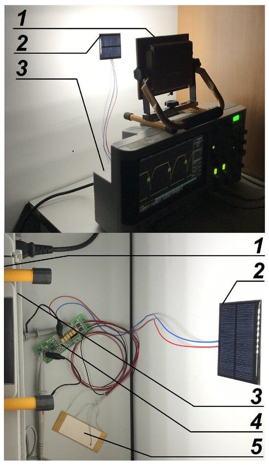 The experimental setup operating under the model light radiation (1) with a photovoltaic panel (2) and digital oscilloscope (3), connected to the energy subsystem (4), tested separate from the PZT transducer (5) in a measurement room (side view on the top and top view on the bottom).