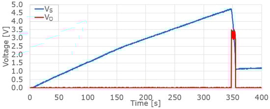 According to the physical model experiment for harvesting wave energy, the voltage increased from 0 V to 4.74 V over 348 s. When the given amount of energy was collected in the storage, and the voltage reached the threshold value, the load was supplied with the harvested energy for 7 s at a mean voltage of 3.2 V. The ES maintained the required voltage of 3.2 V. The measured and voltage waveforms are presented in Figure 4.